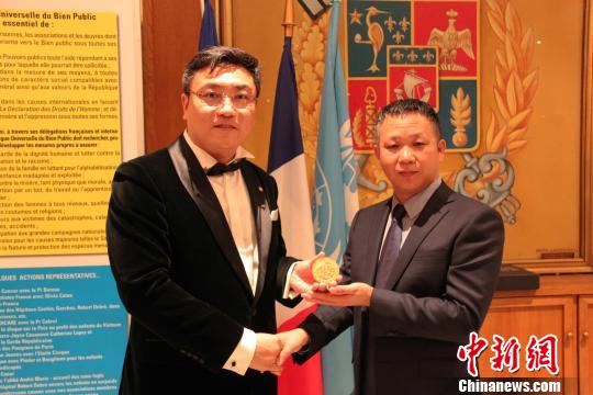 9月21日晚,中國工筆畫家崔景哲(左)在巴黎榮獲全球公益聯(lián)盟文學(藝術(shù))金質(zhì)勛章,也是此次頒獎典禮所有獲獎?wù)咧形ㄒ灰晃恢袊?。江蘇凱旋體育文化董事長吳愛華等知名人士對崔景哲的獲獎表示祝賀。李洋 攝