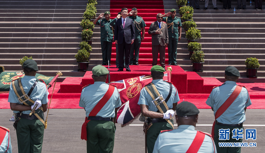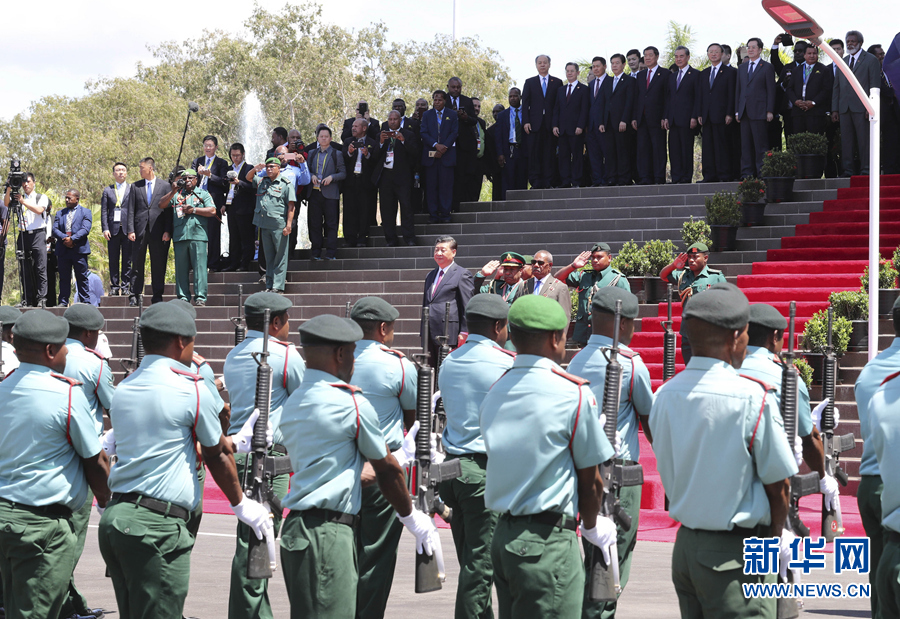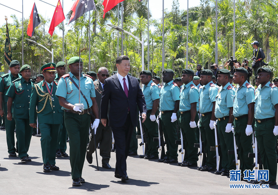 當(dāng)?shù)貢r(shí)間上午10時(shí)30分許,習(xí)近平乘車抵達(dá)議會(huì)大廈,受到達(dá)達(dá)埃熱情迎接。兩國(guó)領(lǐng)導(dǎo)人登上檢閱臺(tái)。軍樂隊(duì)奏中巴新兩國(guó)國(guó)歌。現(xiàn)場(chǎng)鳴21響禮炮。習(xí)近平在達(dá)達(dá)埃陪同下檢閱儀仗隊(duì)。檢閱畢,習(xí)近平同巴新方主要官員握手,達(dá)達(dá)埃同中方陪同人員握手。兩國(guó)領(lǐng)導(dǎo)人共同前往議會(huì)大廈會(huì)見廳,巴布亞新幾內(nèi)亞議長(zhǎng)波馬特等在大廈外迎接并陪同會(huì)見。