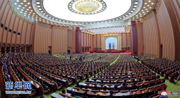 這張朝中社4月12日提供的照片顯示的是11日舉行的朝鮮第14屆最高人民會議第一次會議現(xiàn)場。新華社/朝中社