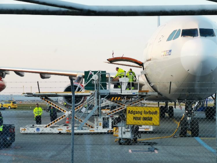 4月4日,在丹麥?zhǔn)锥几绫竟膭P斯楚普國際機場,工作人員將裝有中國大熊貓的箱子搬出,準(zhǔn)備運往哥本哈根動物園。(新華社發(fā) 李鵬飛攝)