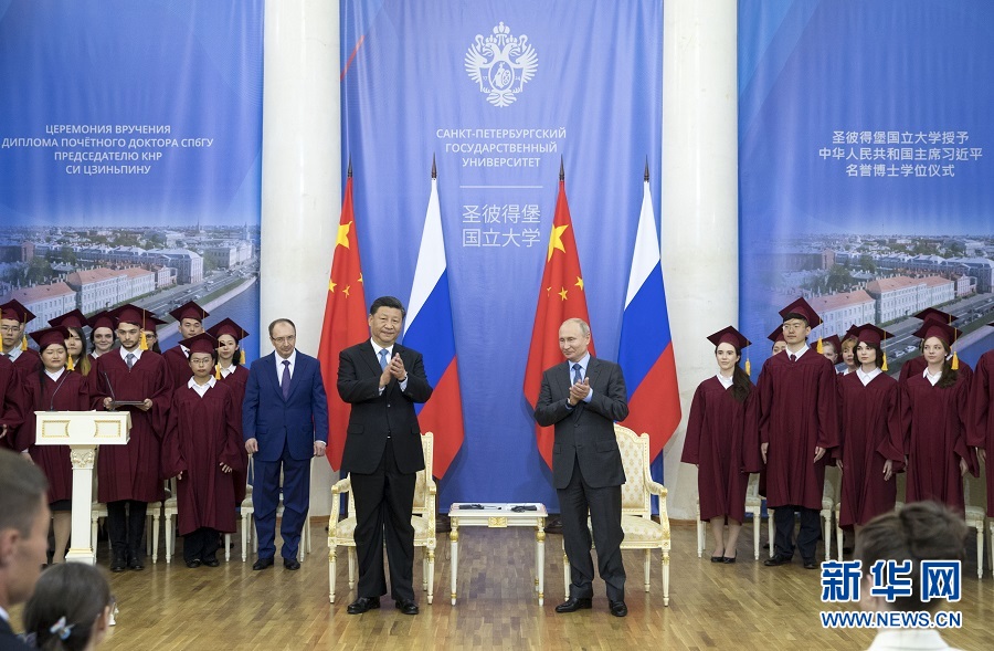 習(xí)近平指出,今年4月,我在北京見證了清華大學(xué)向普京總統(tǒng)頒授名譽(yù)博士學(xué)位。清華大學(xué)和圣彼得堡國立大學(xué)分別是兩國優(yōu)秀高校代表,也是我和普京總統(tǒng)的母校。兩校分別向?qū)Ψ絿以最C授名譽(yù)博士學(xué)位,既是雙方教育和人文領(lǐng)域密切交流的例證,更是中俄關(guān)系高水平的重要體現(xiàn)。希望雙方不斷擴(kuò)大教育領(lǐng)域交流合作,廣泛傳播各自優(yōu)秀文化,兼容并蓄,互學(xué)互鑒,為兩國各自發(fā)展建設(shè)培養(yǎng)更多優(yōu)秀人才。