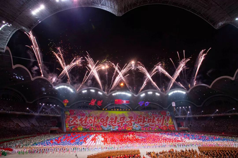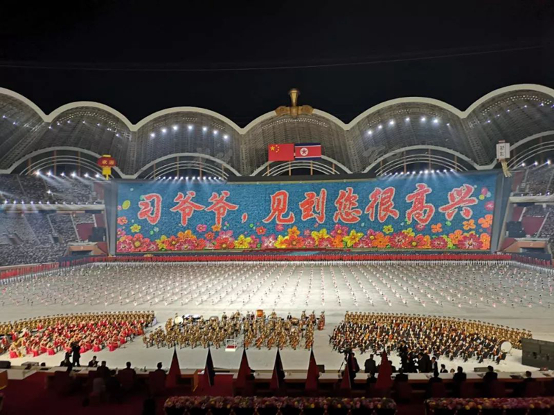 這臺(tái)演出為習(xí)近平此訪專門精心創(chuàng)作,數(shù)萬(wàn)名朝鮮演員參加表演,朝鮮三大樂(lè)團(tuán)首次同臺(tái)獻(xiàn)藝,整場(chǎng)演出氣勢(shì)恢宏、震撼感人。