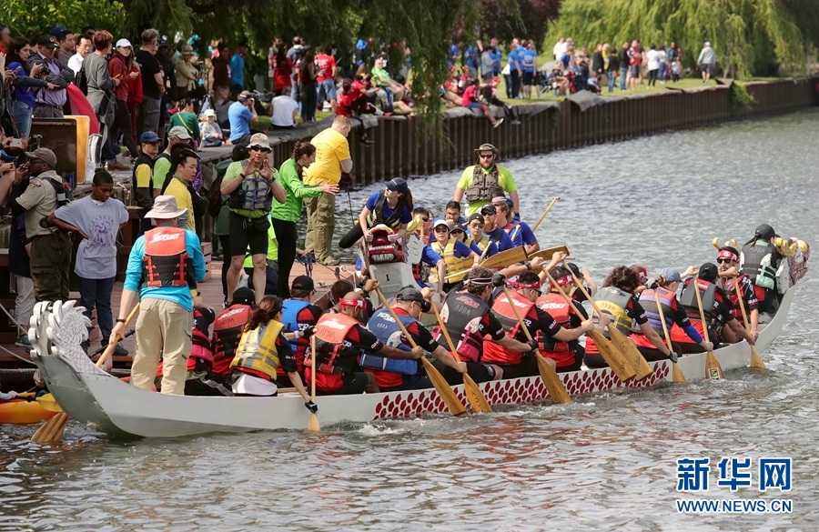 6月22日,由芝加哥華商會(huì)舉辦的第19屆芝加哥龍舟賽在中國(guó)城譚繼平公園舉行,這是參賽的隊(duì)員在比賽。記者 汪平 攝