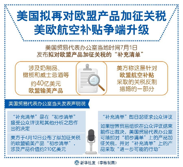 新華社華盛頓7月1日電(記者熊茂伶 鄧仙來)美國貿易代表辦公室1日發(fā)布擬對歐盟產品加征關稅的“補充清單”,涉及奶制品、橄欖和威士忌酒等約40億美元歐盟輸美產品。美方稱這是針對歐盟航空補貼采取的關稅反制措施的一部分。