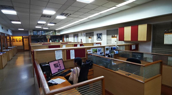 文卡特斯瓦倫負責《印度教徒報》的頭條版樣設計。他的辦公室門口,整整齊齊地碼放著其他報紙的刊樣。