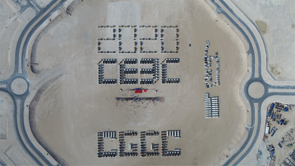 當(dāng)天上午,在主題為“攜手共建‘一帶一路’,奔跑筑夢(mèng)精彩未來(lái)”的長(zhǎng)跑活動(dòng)開(kāi)幕式現(xiàn)場(chǎng),由240多輛卡車(chē)、挖掘機(jī)、平地機(jī)等車(chē)輛設(shè)備擺出的2020、CEEC(中國(guó)能建英文縮寫(xiě))、CGGC(葛洲壩集團(tuán)英文縮寫(xiě))字樣排布在沙漠上,氣勢(shì)壯觀(guān)。