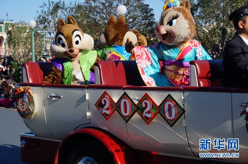 1月1日,在日本東京迪士尼海洋樂園,裝扮成迪士尼卡通人物的演員在新年巡游上表演。楊汀 攝