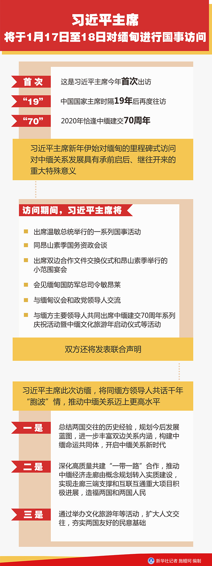 羅照輝表示,應(yīng)溫敏總統(tǒng)邀請(qǐng),習(xí)近平主席將于1月17日至18日對(duì)緬甸進(jìn)行國(guó)事訪問(wèn)。這是習(xí)近平主席今年首次出訪,是中國(guó)國(guó)家主席時(shí)隔19年后再度往訪,又恰逢中緬建交70周年,對(duì)中緬關(guān)系發(fā)展具有承前啟后、繼往開(kāi)來(lái)的重大特殊意義。緬甸是中國(guó)友好鄰邦。當(dāng)前,兩國(guó)政治上高度互信,經(jīng)濟(jì)上深度合作,國(guó)際地區(qū)問(wèn)題上密切配合,“胞波”情誼歷久彌新,民間往來(lái)高位運(yùn)行。建交70年來(lái),中緬關(guān)系在互尊、互信、互助的基礎(chǔ)上不斷發(fā)展,樹(shù)立了大小國(guó)家間和睦相處、合作共贏的典范。中方堅(jiān)持不干涉緬內(nèi)政,堅(jiān)定支持緬甸維護(hù)國(guó)家尊嚴(yán)和合法權(quán)益。在緬甸國(guó)內(nèi)和平和解問(wèn)題上,中方勸和促談,發(fā)揮建設(shè)性作用。緬方在涉及臺(tái)灣、西藏、新疆問(wèn)題上一直堅(jiān)定支持中方。緬甸積極響應(yīng)和參與“一帶一路”合作倡議。中緬經(jīng)濟(jì)走廊及大項(xiàng)目合作帶動(dòng)了緬方沿線就業(yè)和經(jīng)濟(jì)發(fā)展,極大提升了當(dāng)?shù)厝嗣裆钏?。中緬?jiān)持踐行和平共處五項(xiàng)原則,堅(jiān)持國(guó)際關(guān)系基本準(zhǔn)則,支持多邊主義、維護(hù)自由貿(mào)易,共同為推動(dòng)建立公正合理的新型國(guó)際關(guān)系作出貢獻(xiàn)。雙方在聯(lián)合國(guó)、東亞合作等場(chǎng)合相互支持,在建立中國(guó)-東盟自貿(mào)區(qū),區(qū)域全面經(jīng)濟(jì)伙伴關(guān)系、“南海行為準(zhǔn)則”磋商等方面密切協(xié)調(diào)配合。