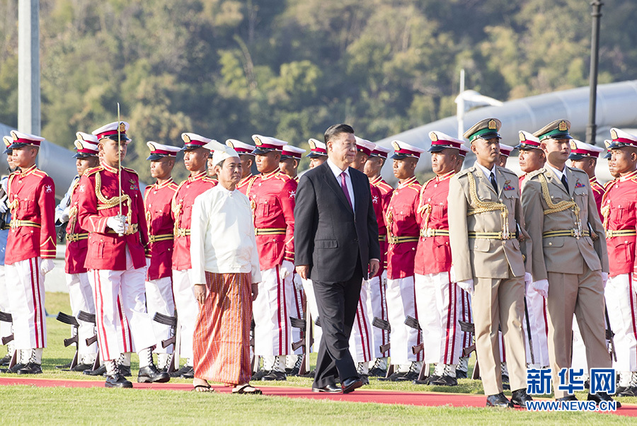 當(dāng)?shù)貢r(shí)間1月17日下午,國(guó)家主席習(xí)近平在內(nèi)比都總統(tǒng)府出席緬甸總統(tǒng)溫敏舉行的隆重歡迎儀式。這是習(xí)近平在溫敏陪同下檢閱儀仗隊(duì)。 新華社記者 黃敬文 攝