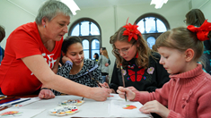 臨近中午,居住在附近的數(shù)十位家長帶著小朋友前來體驗中國農(nóng)歷新年活動,小朋友們從咿呀學語到小學各年級不等,其中有些是第一次感受中國春節(jié)。中共六大會址常設展覽館為他們準備了多項特色活動。在充滿喜慶紅色的大廳里,小朋友、家長與展覽館工作人員圍在一張大桌子周圍。家長們手把著小朋友們的手,沿著一張張紙的邊緣不斷剪裁,再把剪裁下來的部分不斷折疊起來。不一會,一只只小老鼠就出現(xiàn)在了孩子們的手中。