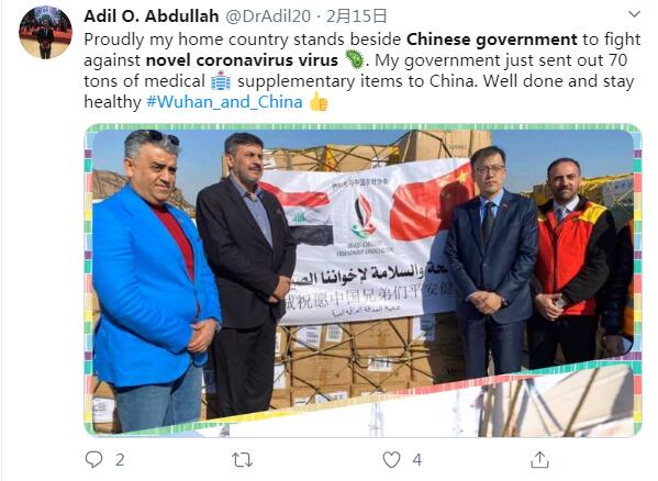推特用戶Adil O. Abdullah說:我的祖國支持中國政府抗擊新冠肺炎病毒,我為此感到驕傲。我們的政府向中國送去了70噸的醫(yī)療補(bǔ)給物資,干得不錯(cuò)。武漢和全中國都要平安康泰。