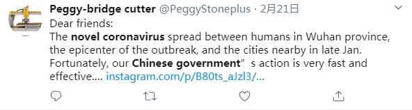 推特用戶Peggy-bridge cutter說:親愛的朋友們,新冠肺炎疫情在武漢和周邊城市暴發(fā)。所幸,中國政府采取了迅速、有效的行動(dòng)。