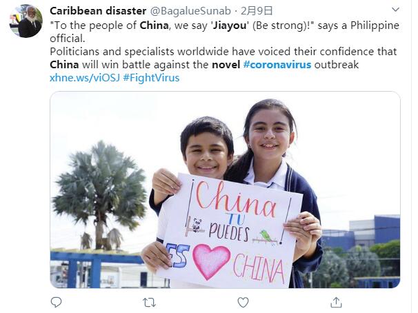 推特用戶Caribbean disaster說:一名菲律賓官員表示,想要對中國人民說,你們加油。世界各地的政治家和專家紛紛表示,對中國戰(zhàn)勝新冠疫情很有信心。(作者: 嚴(yán)玉潔 資料來源:新華社、央視網(wǎng)、人民網(wǎng)、國際在線等)