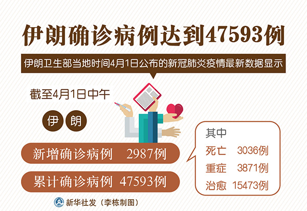 新華社德黑蘭4月1日電(記者陳霖)伊朗衛(wèi)生部4月1日公布的新冠肺炎疫情最新數(shù)據(jù)顯示,截至當(dāng)天中午,伊朗新增確診病例2987例,累計(jì)確診病例47593例,其中死亡3036例,重癥3871例,治愈15473例。
