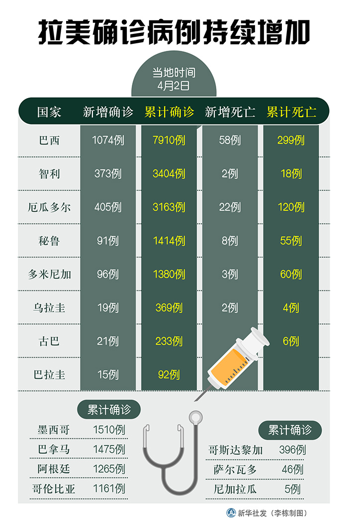 新華社圣保羅4月2日電 綜合新華社駐拉美地區(qū)記者報(bào)道:拉美各國(guó)衛(wèi)生部門2日發(fā)布的新冠疫情最新數(shù)據(jù)顯示,拉美地區(qū)確診病例持續(xù)增加。多國(guó)采取了隔離、停課、宵禁等措施應(yīng)對(duì)疫情。