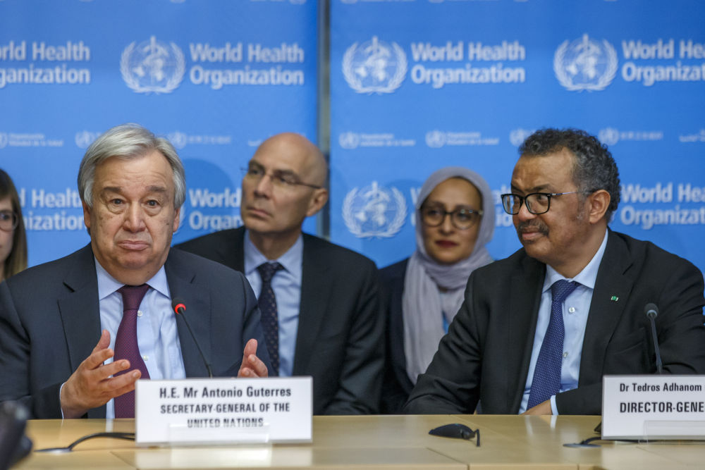 2月24日,在瑞士日內(nèi)瓦,聯(lián)合國(guó)秘書(shū)長(zhǎng)古特雷斯(左)在世界衛(wèi)生組織總部發(fā)表講話。新華社發(fā)