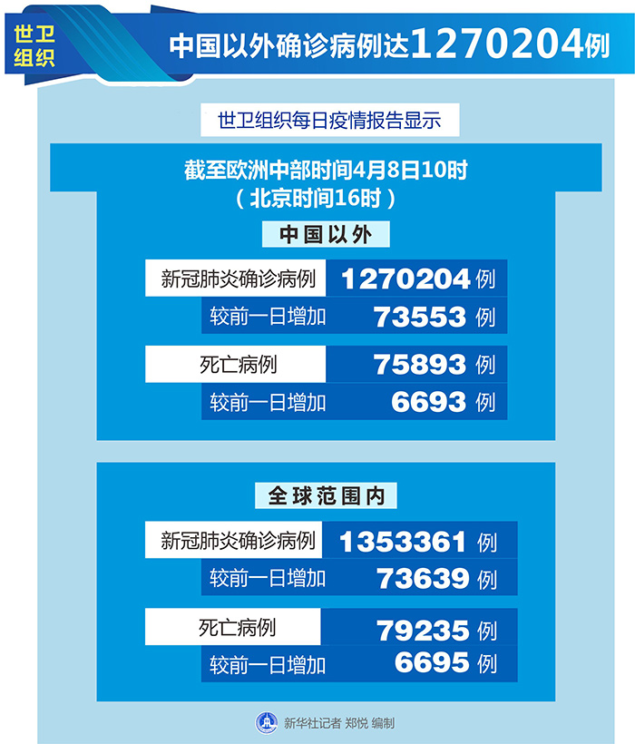 新華社日內(nèi)瓦4月8日電(記者劉曲)世界衛(wèi)生組織8日公布的最新數(shù)據(jù)顯示,中國以外新冠確診病例達到1270204例。