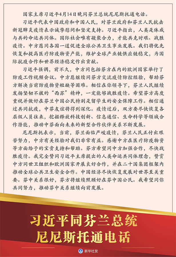 習(xí)近平強(qiáng)調(diào),前不久,中方同包括芬方在內(nèi)的歐洲國家舉行了防疫工作視頻會議。中方愿繼續(xù)同芬方交流疫情防控經(jīng)驗(yàn),幫助芬方解決當(dāng)前防疫物資短缺等困難。相信在你領(lǐng)導(dǎo)下,芬蘭人民繼續(xù)發(fā)揚(yáng)堅(jiān)韌不拔的“西蘇”精神,一定能夠戰(zhàn)勝疫情。希望芬方高度重視并做好在芬蘭中國公民特別是留學(xué)生的安全保障工作。相信通過共同抗疫,中芬友誼將得到深化。疫情過后,雙方要盡快恢復(fù)各層級人員往來,挖掘釋放科技創(chuàng)新、信息通信、生命科學(xué)等領(lǐng)域合作潛能,推動中芬面向未來的新型合作伙伴關(guān)系不斷發(fā)展。