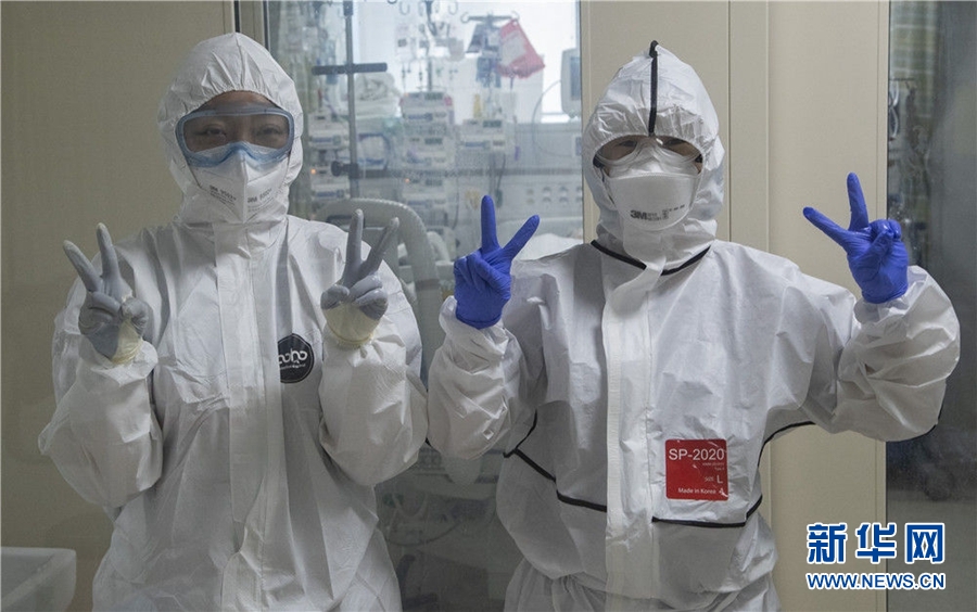 3月18日,在韓國大邱啟明大學東山醫(yī)院,醫(yī)護人員對記者擺出勝利手勢。新華社發(fā)(李相浩攝)