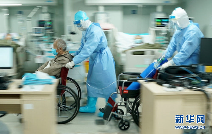 3月20日,武漢火神山醫(yī)院重癥醫(yī)學一科副主任宋立強(中)護送81歲的新冠肺炎重癥患者去做CT檢查。為確?;颊哂谐渥愎┭酰t(yī)生胡世頡推著氧氣瓶隨行。新華社記者 王毓國 攝
