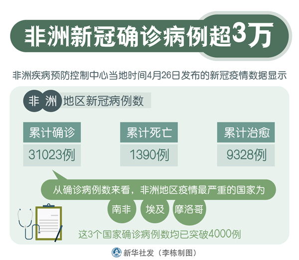 新華社達(dá)累斯薩拉姆4月26日電 綜合新華社駐非洲地區(qū)記者報道:非洲疾病預(yù)防控制中心26日發(fā)布的新冠疫情數(shù)據(jù)顯示,非洲地區(qū)新冠累計(jì)確診病例數(shù)為31023例,累計(jì)死亡1390例,累計(jì)治愈9328例。為支持非洲各國抗擊新冠疫情,聯(lián)合國推出信息平臺協(xié)助抗疫。