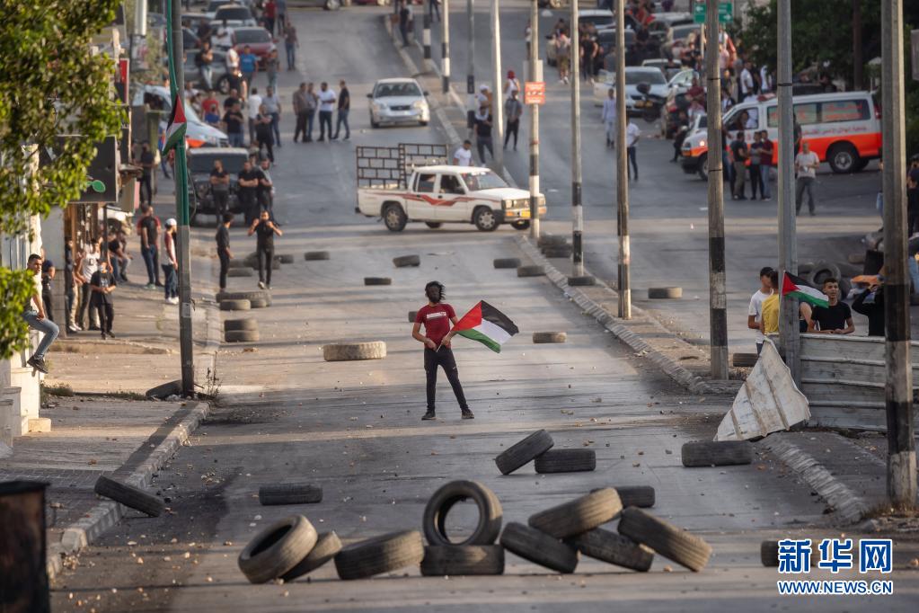 5月20日,抗議者手持巴勒斯坦國旗站在約旦河西岸城市伯利恒一條被封鎖的路上。