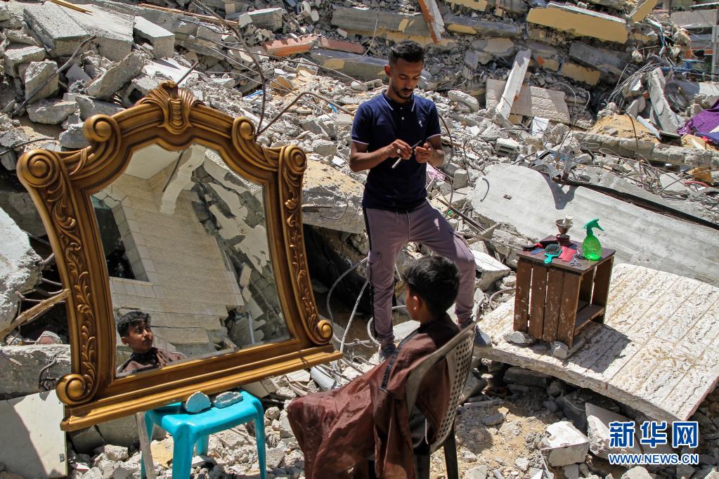 5月26日,在加沙地帶北部的城鎮(zhèn)貝特拉希亞,23歲的巴勒斯坦理發(fā)師阿卜杜拉·扎瓦拉在他被以色列炸毀的房屋前為顧客免費(fèi)服務(wù)?!⌒氯A社發(fā)(里澤克·阿卜杜勒·賈瓦德攝)