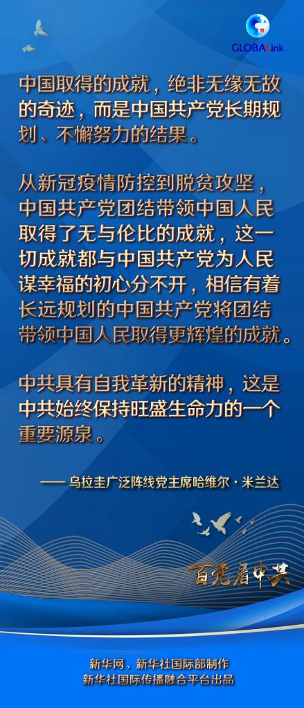 今年是中國(guó)共產(chǎn)黨建黨百年,米蘭達(dá)代表烏拉圭廣泛陣線黨表示熱烈祝賀。他表示,中共具有自我革新的精神,這是中共始終保持旺盛生命力的一個(gè)重要源泉。